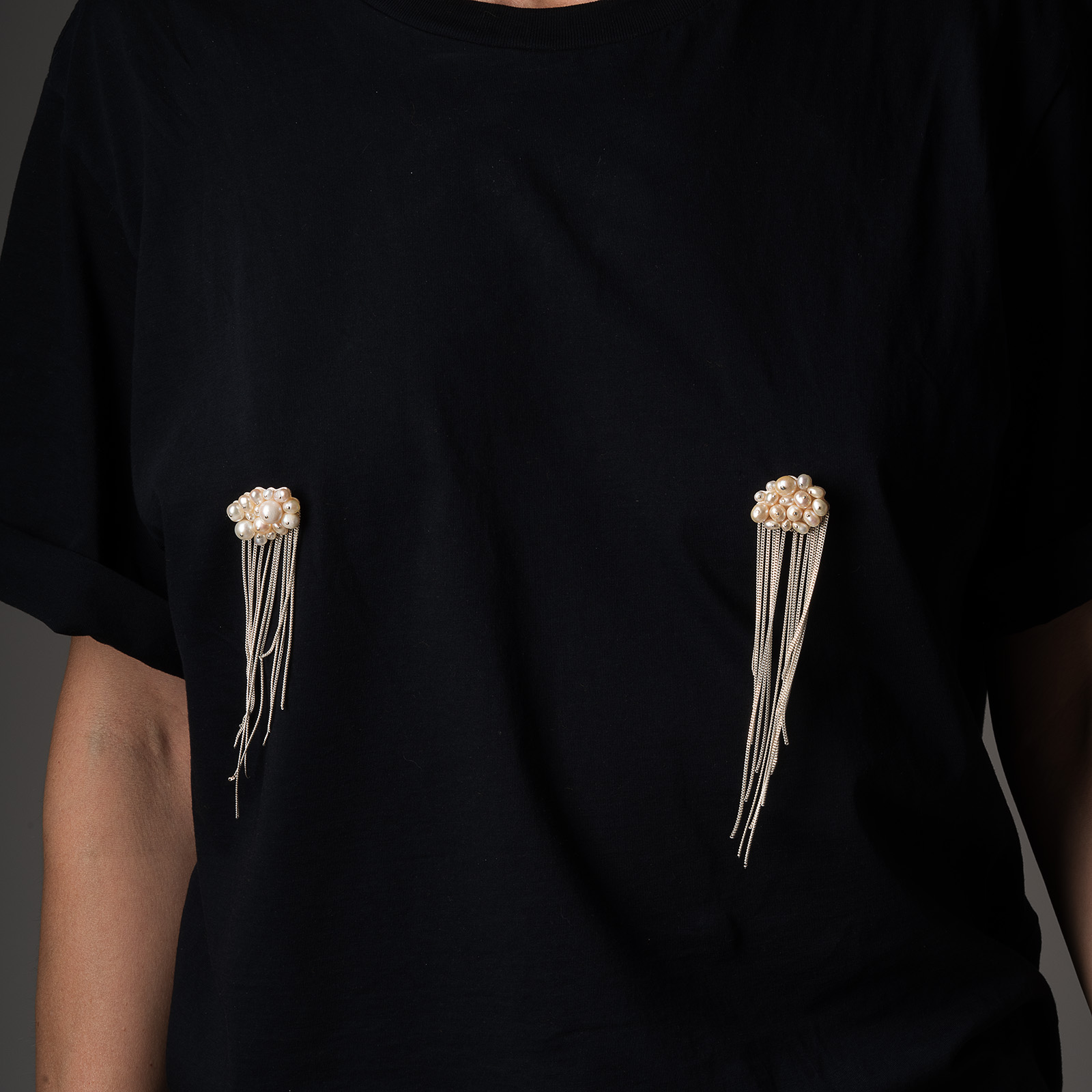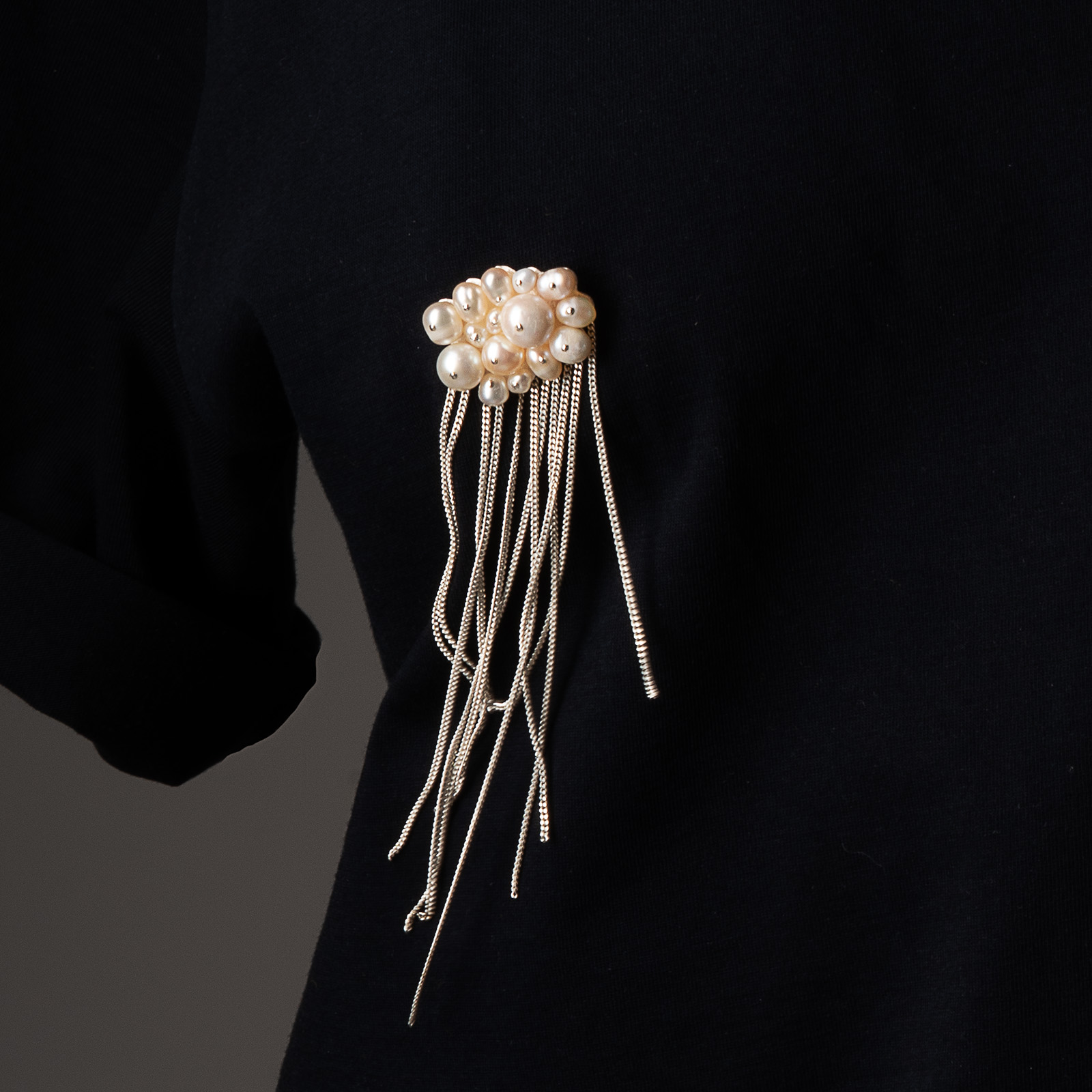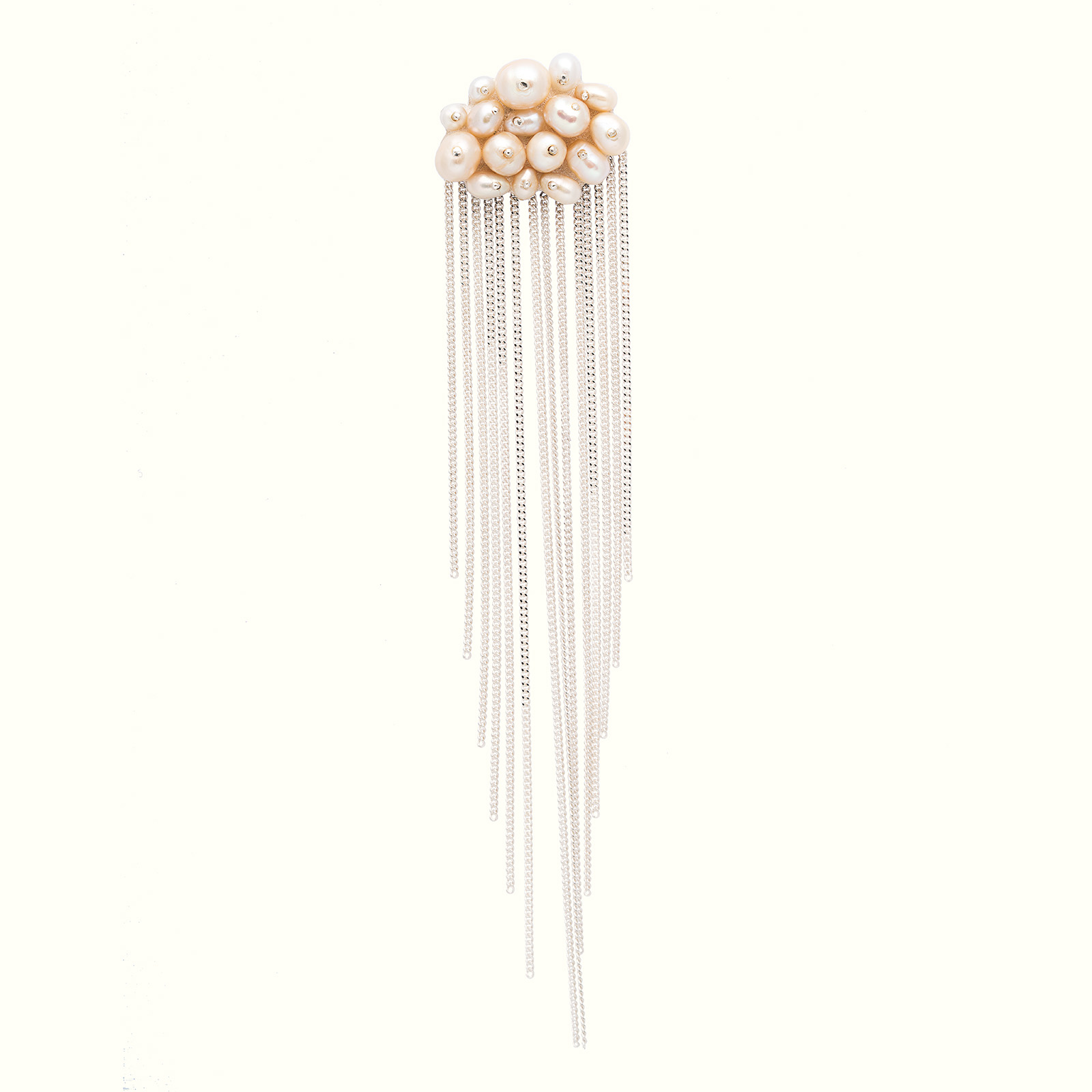 Жемчужная тучка с на пластине из серебра 925 пробы и каскадом цепей. Материал: серебро, жемчуг.