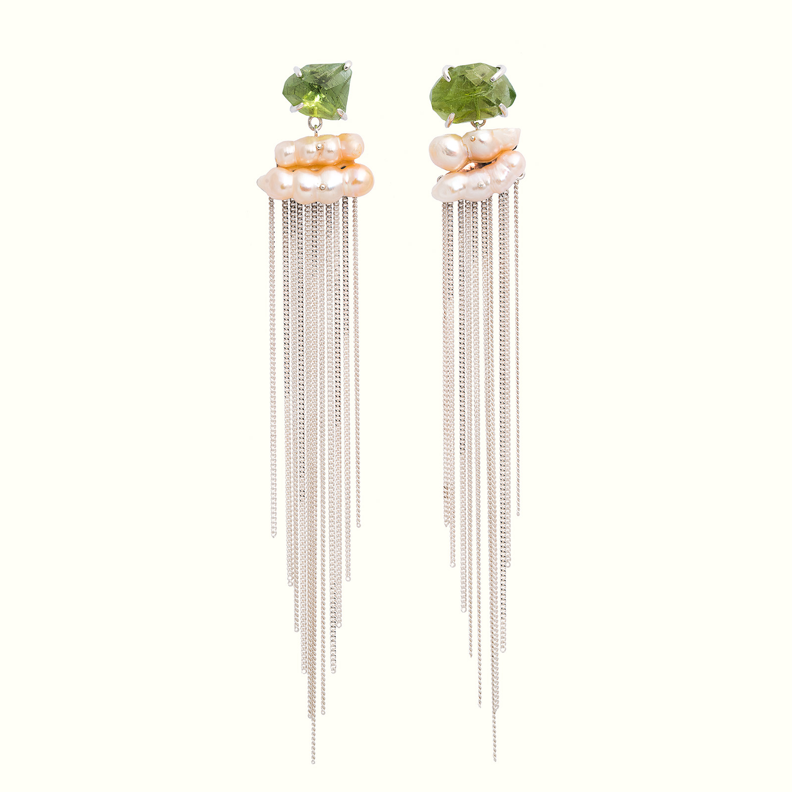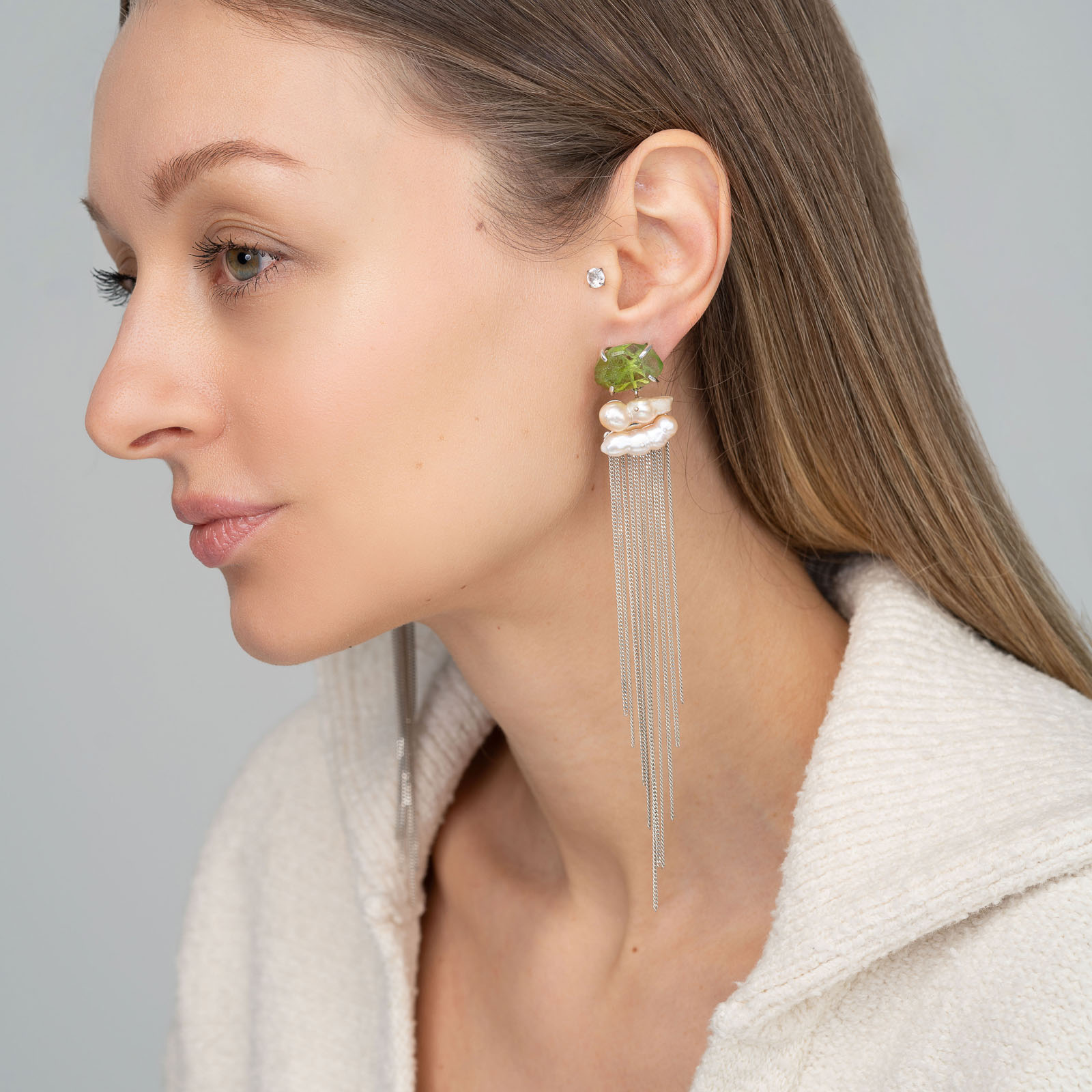 Лимитированная коллекция Le jeu. Серьги с необработанным перидотом, жемчугом и каскадом серебряных цепей.