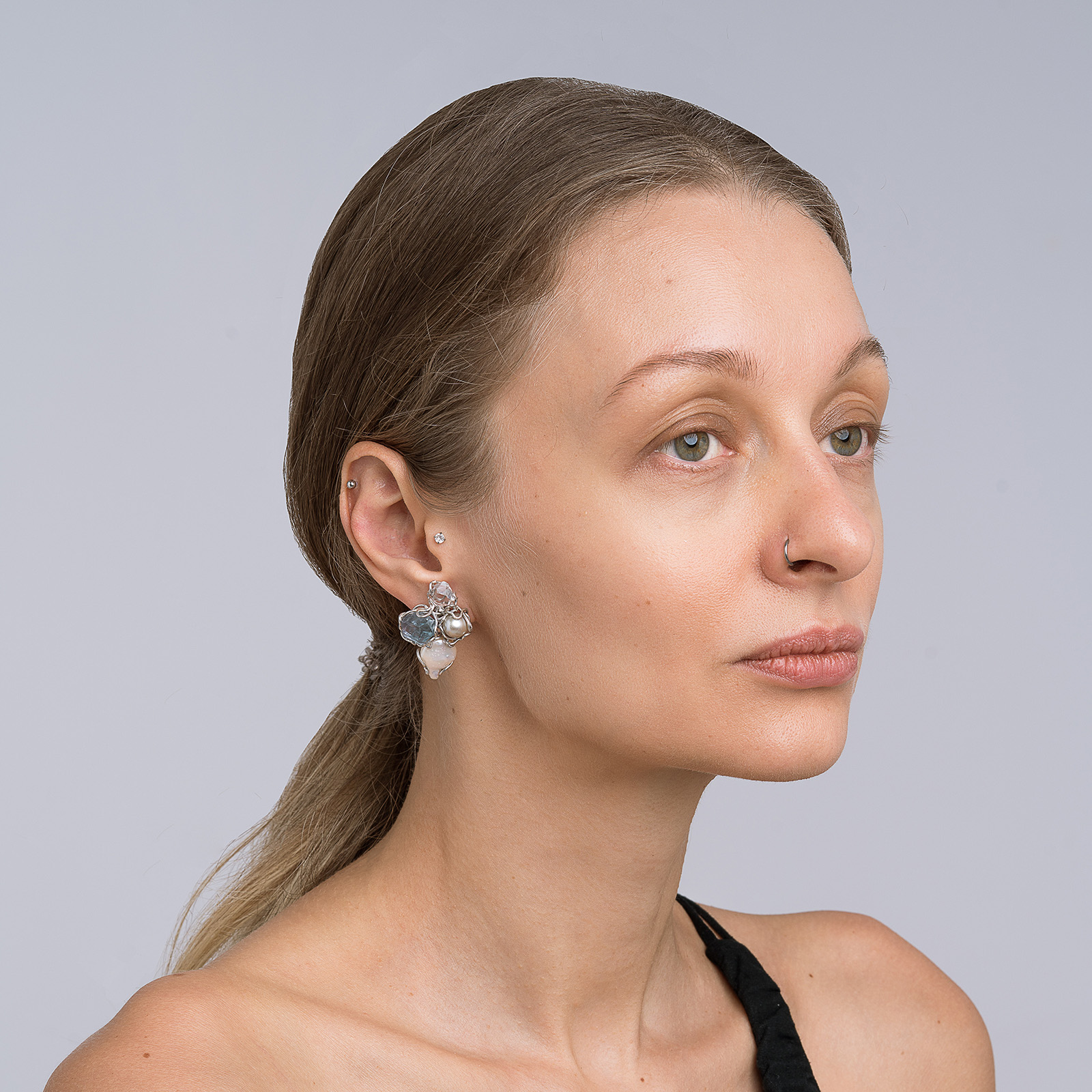 Лимитированная коллекция Le jeu. Элегантные серьги с жемчугом и raw камнями – даймонд кварцем и флюоритом. Серебро 925 пробы.