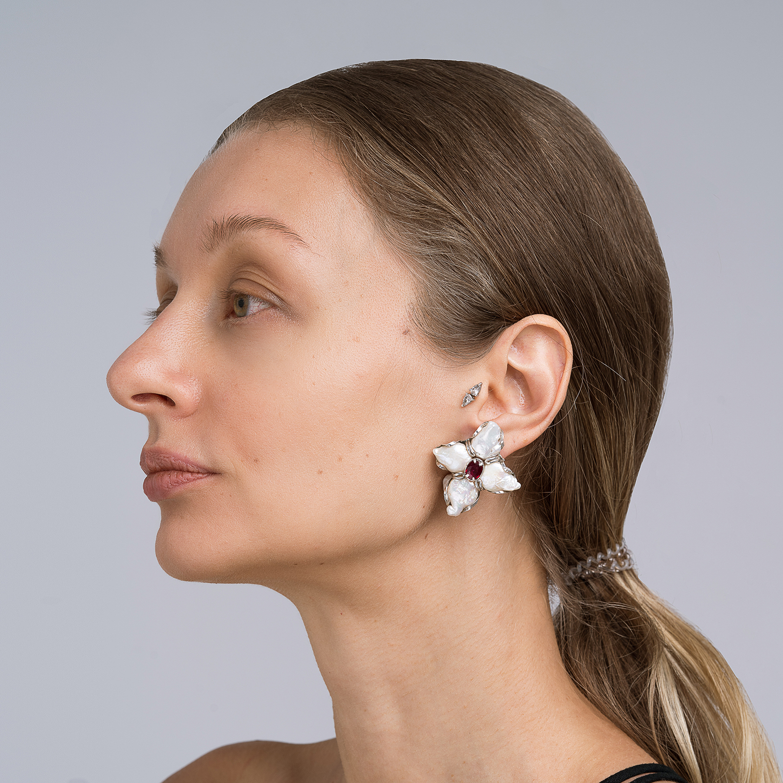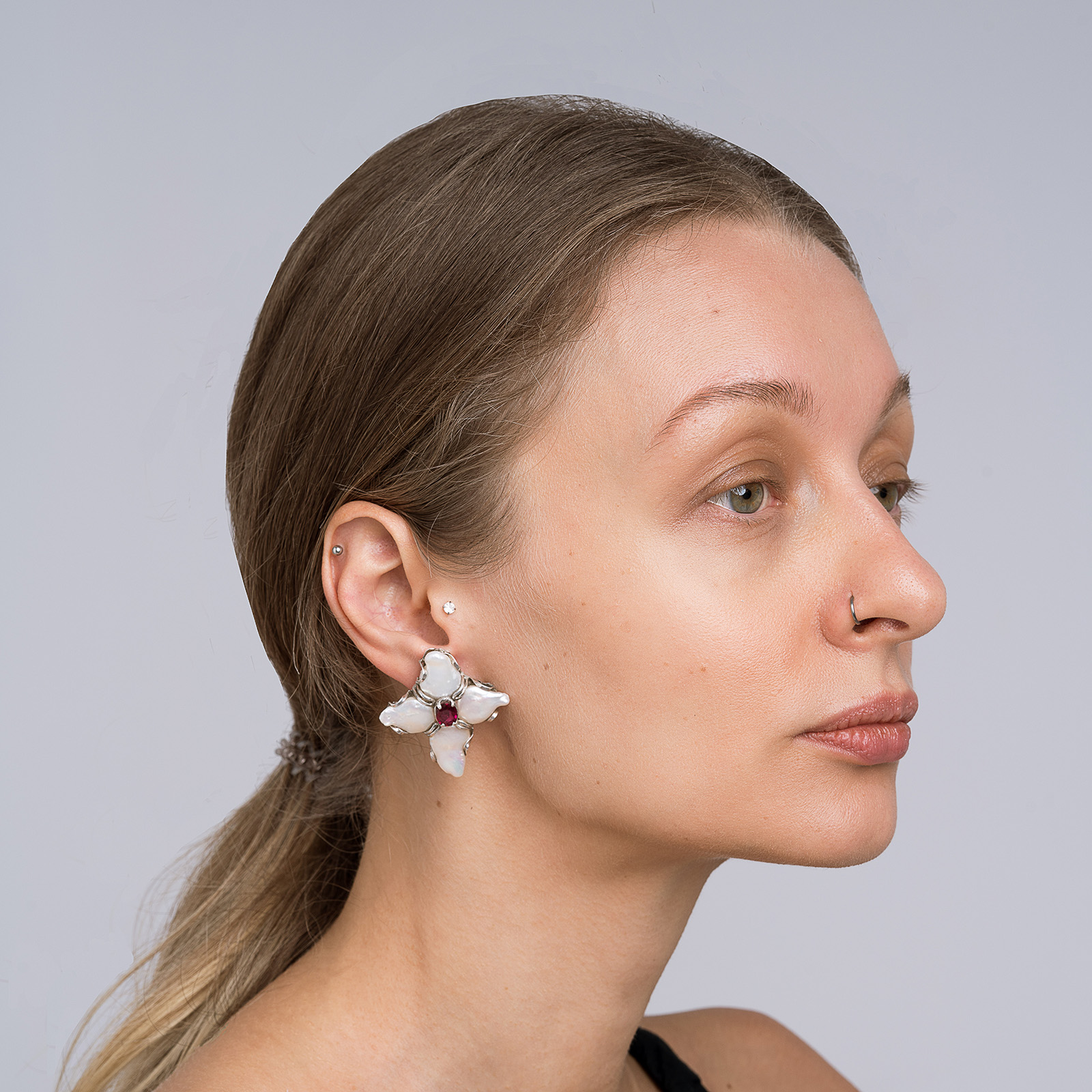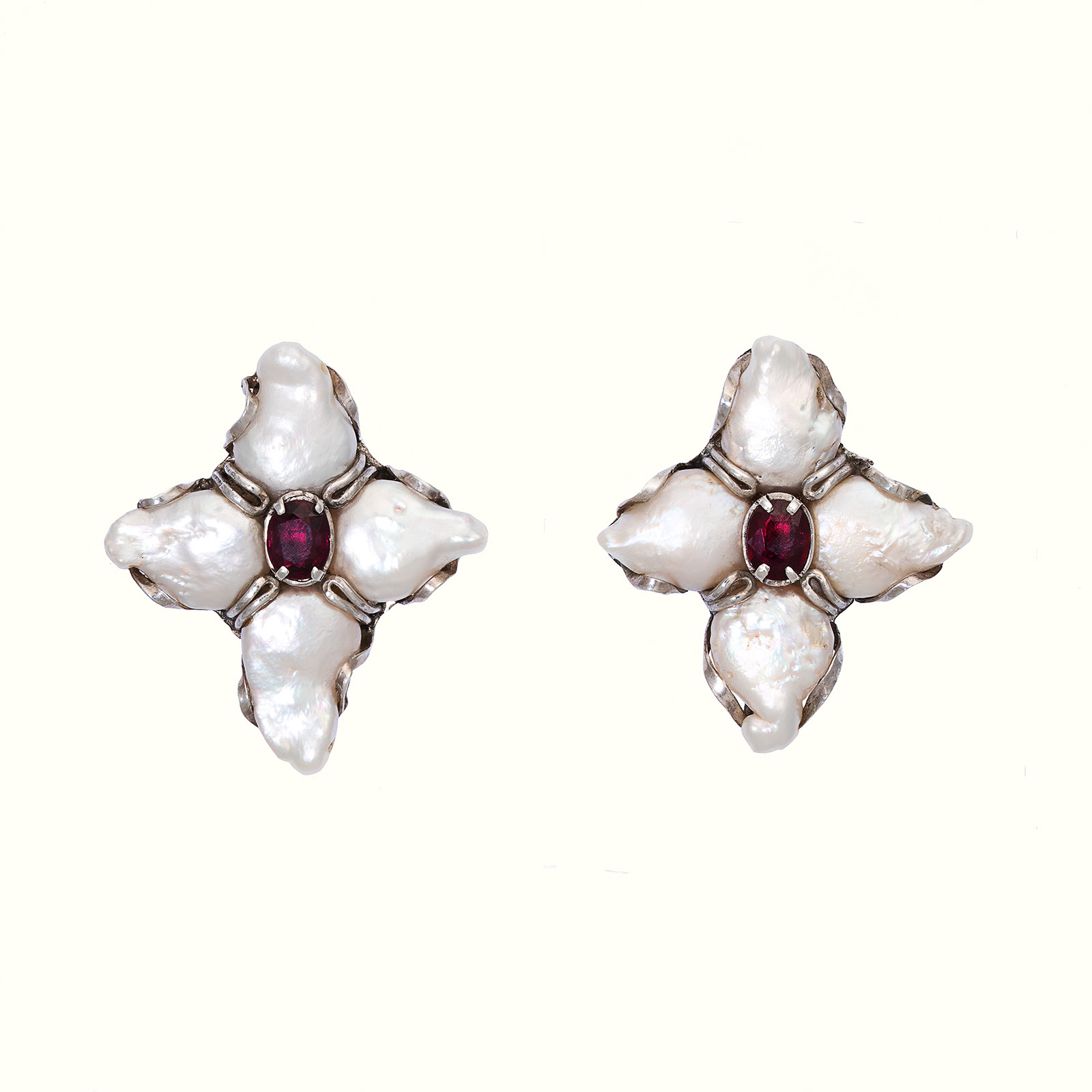 Серьги-кресты с рубинами и белым жемчугом изогнутой формы. Серебро 925 пробы.