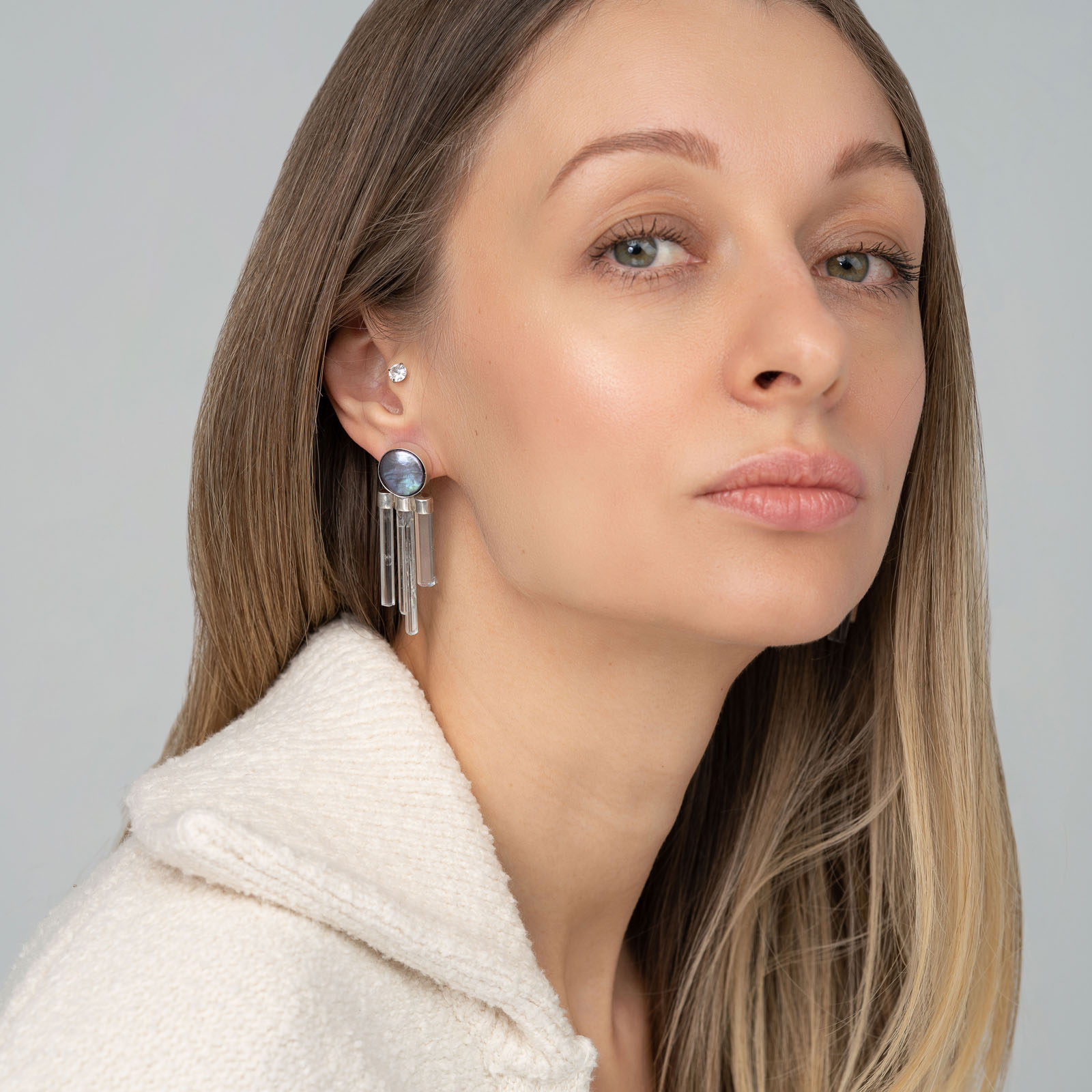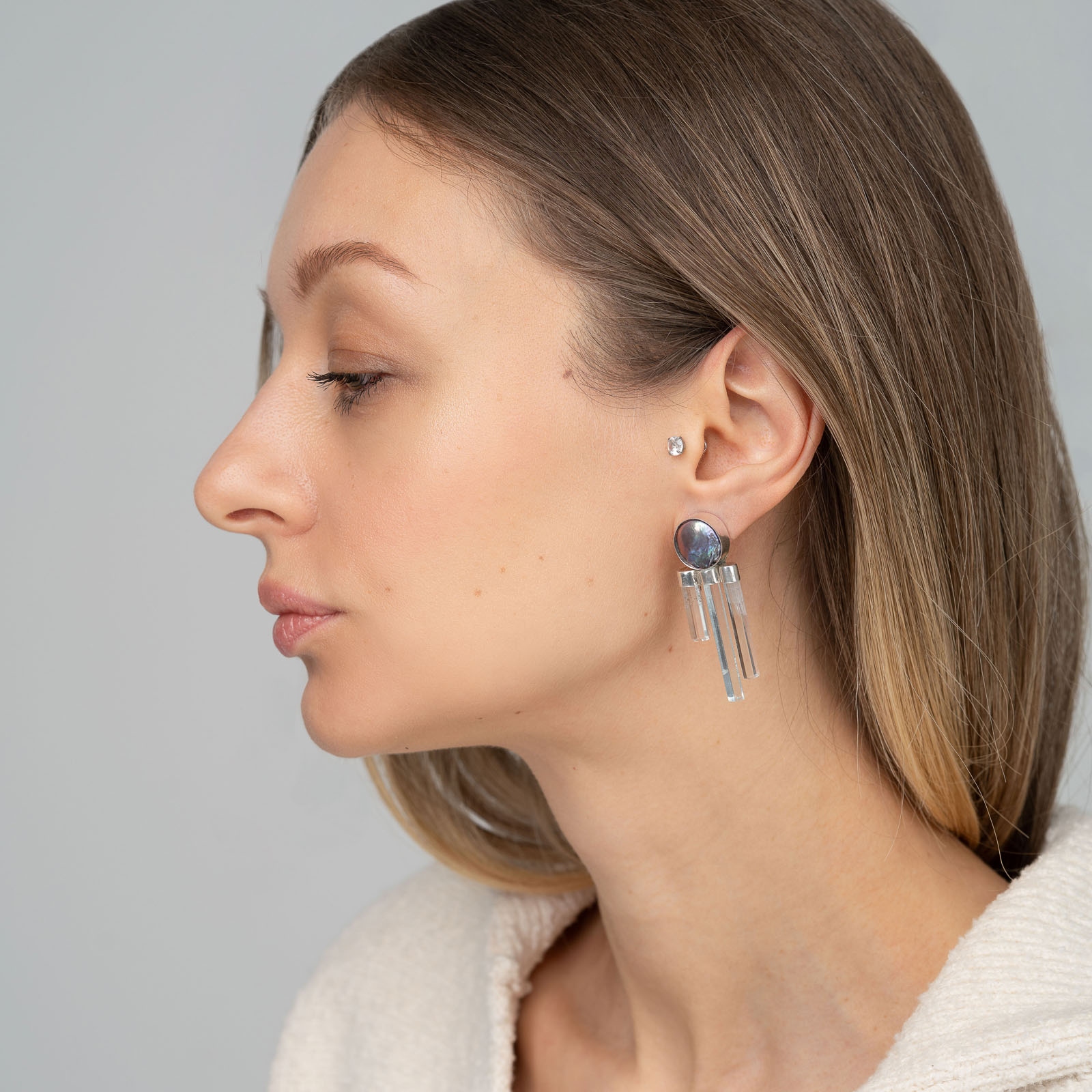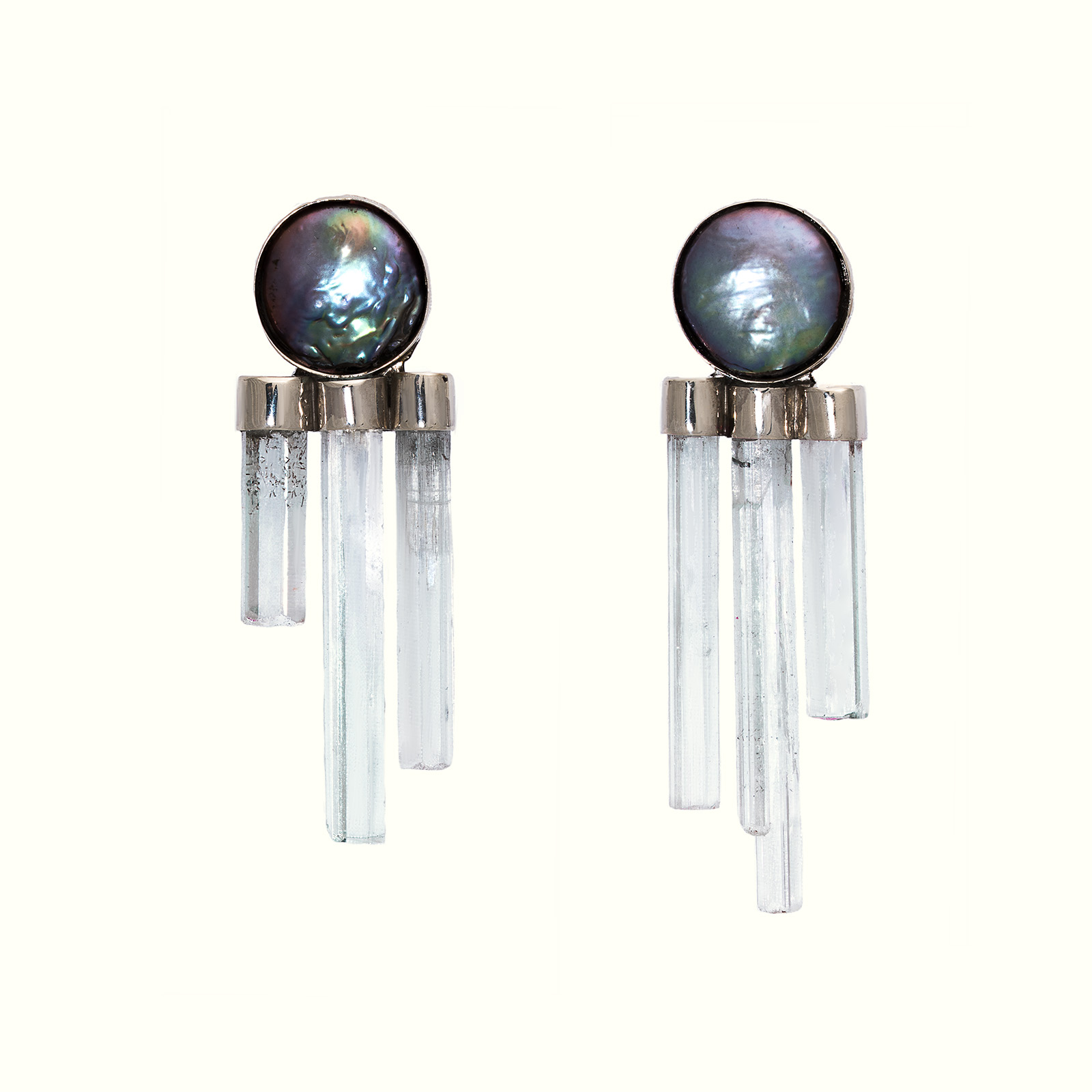 Лимитированная коллекция Le jeu. Серьги с серым жемчугом и необработанным голубым аквамарином. Материал: серебро 925 пробы, жемчуг, аквамарин.